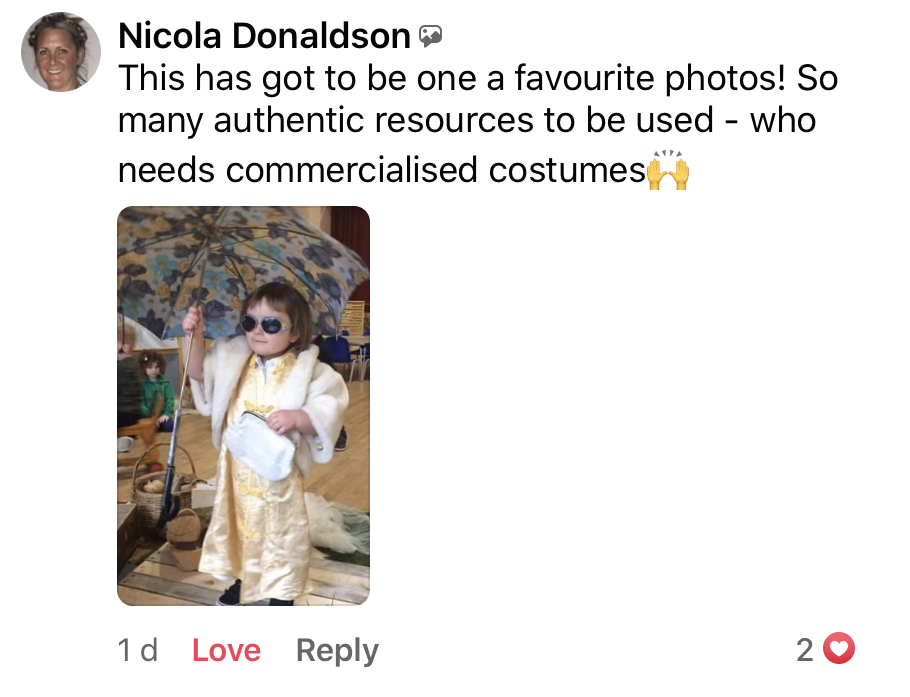 This is in a move to transform traditional educational practice & promote authentic play & creativity, we unleash ourselves & more importantly the children from the constraints of costumes and commercialised outfits.